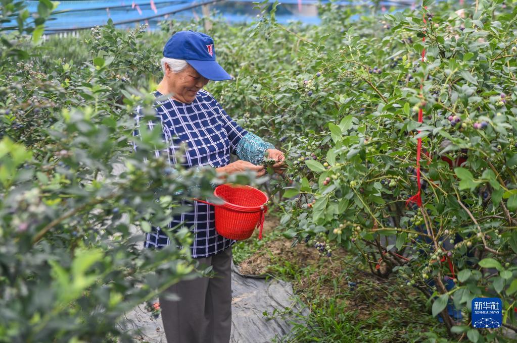 6月3日,在位于长兴县虹星桥镇谭家村的金蓝家庭农场的蓝莓种植区内,作为帮工的村民采摘成熟的蓝莓。果蔬采摘给当地村民带来了不少收入。