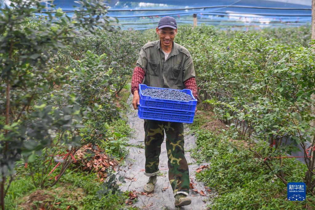 6月3日,在位于长兴县虹星桥镇谭家村的金蓝家庭农场的蓝莓种植区内,种植户搬运刚采摘的蓝莓。