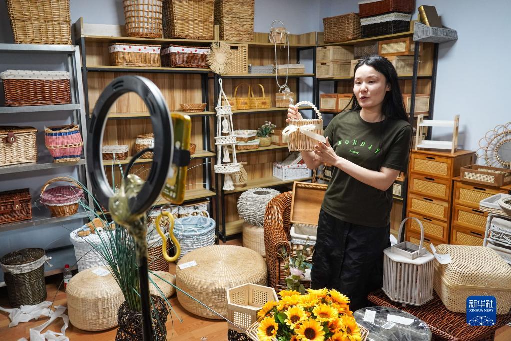 6月6日,临沂金柳工艺品有限公司员工在电商平台销售柳编产品。