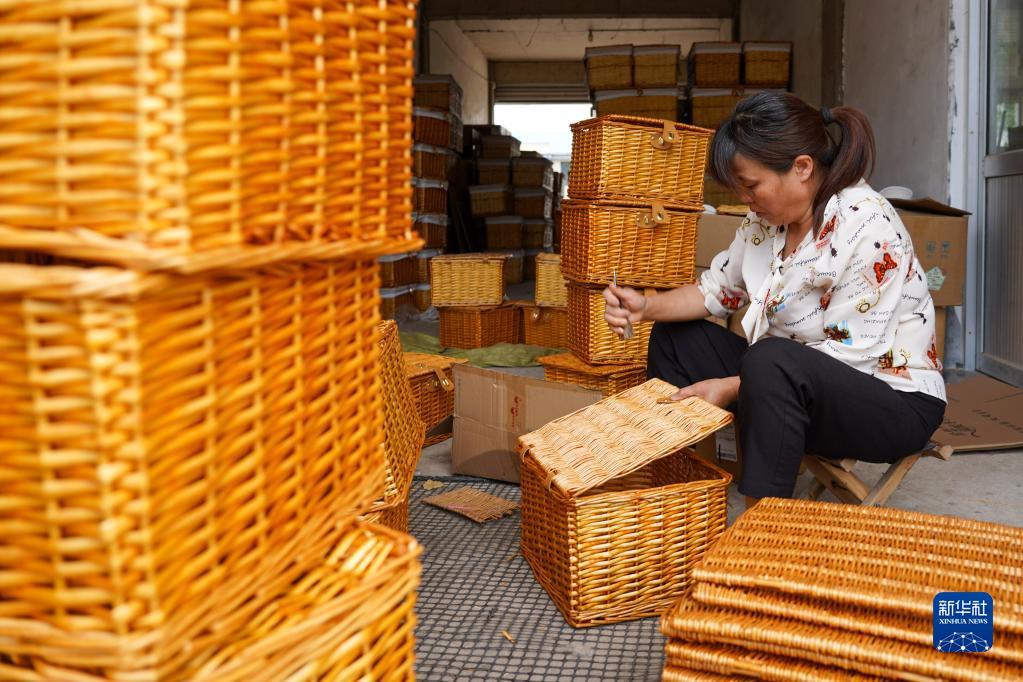 6月6日,临沭县青云镇西朱崔村居民在加工点生产柳编产品。