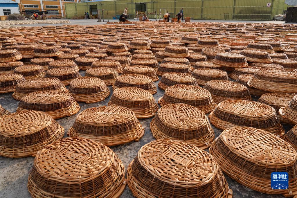 6月6日,临沂金柳工艺品有限公司员工在晾晒柳编产品。