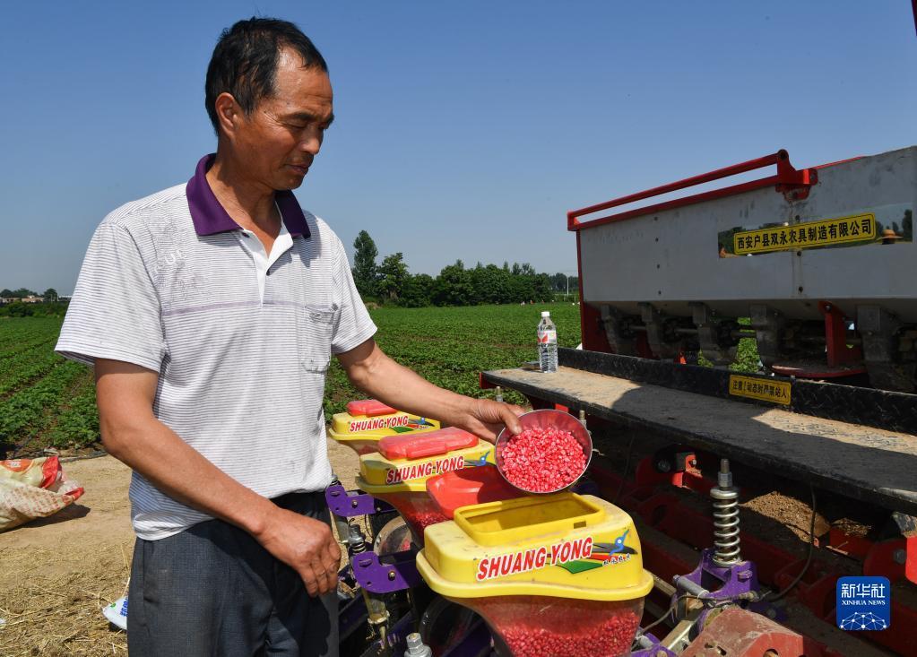6月13日,在陕西省西安市鄠邑区五竹街道,农户向播种机放入玉米种子。