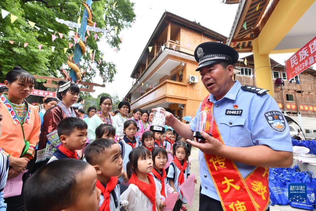 6月20日,在广西融水苗族自治县杆洞乡乌英苗寨,民警介绍禁毒知识。