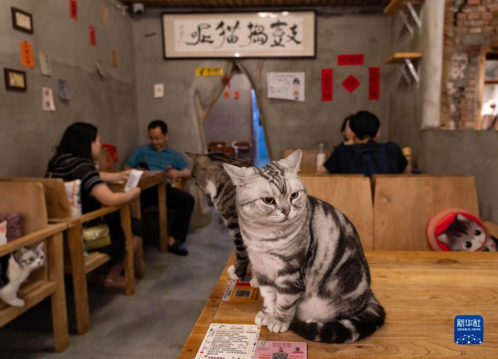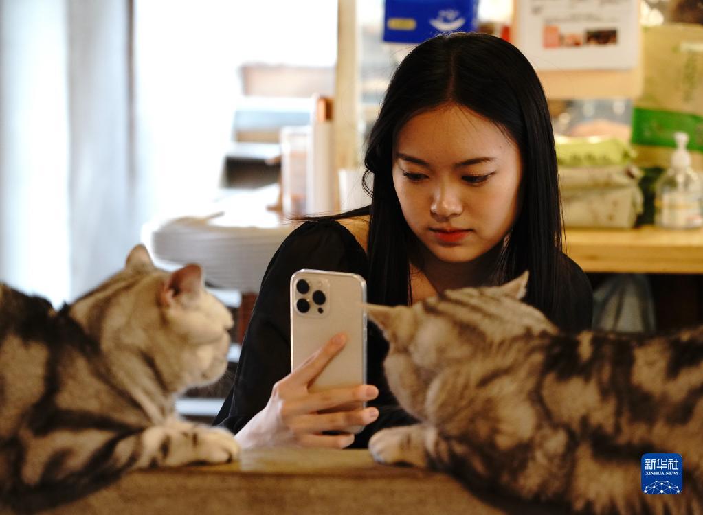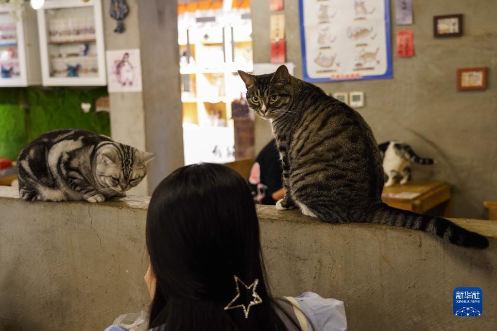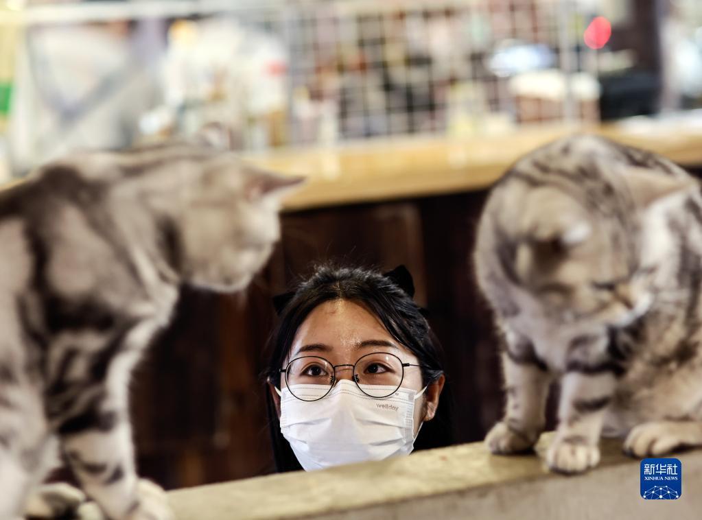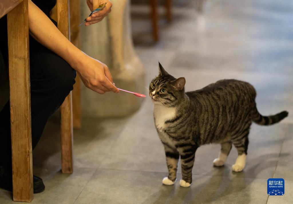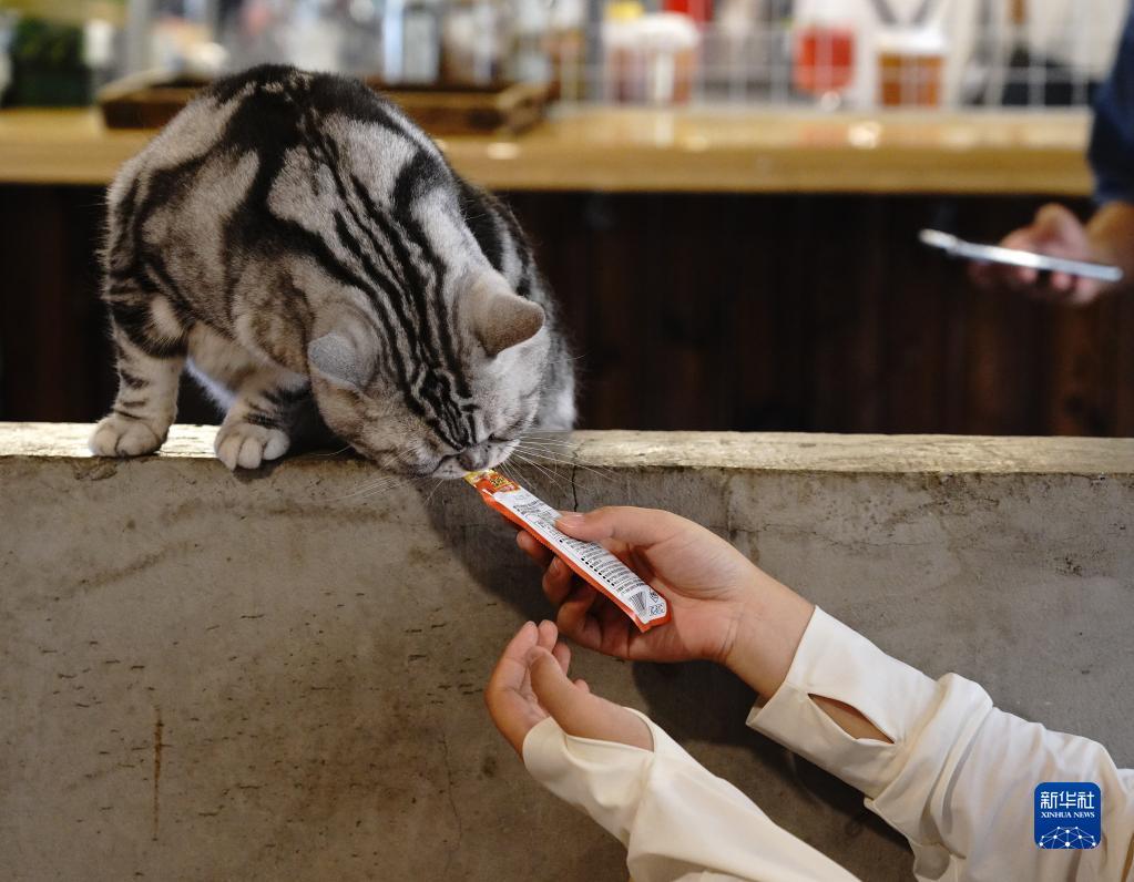 顾客给猫咪“尾牙”喂食(6月7日摄)。