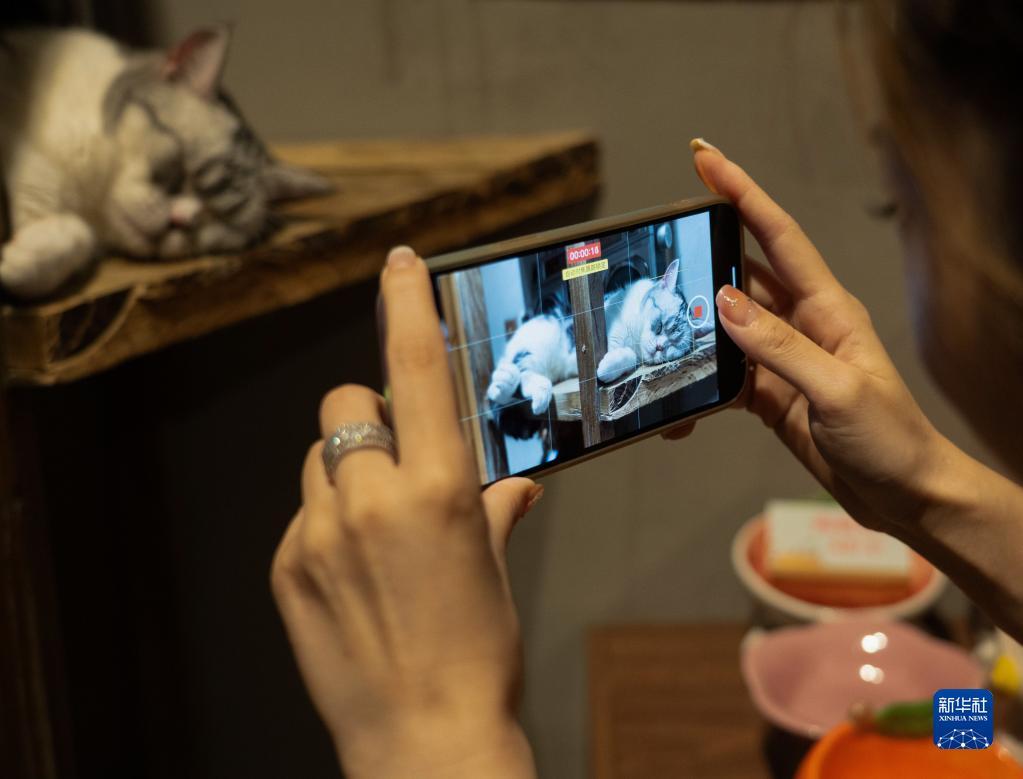 一名顾客拍摄正在睡觉的猫咪“小哪吒”(6月19日摄)。“小哪吒”假装摔倒“碰瓷”路人的视频在网络上走红。