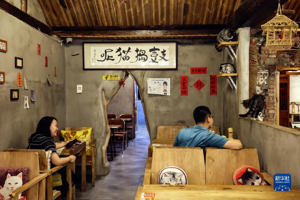 顾客与猫咪“通宝”互动(6月10日摄)。