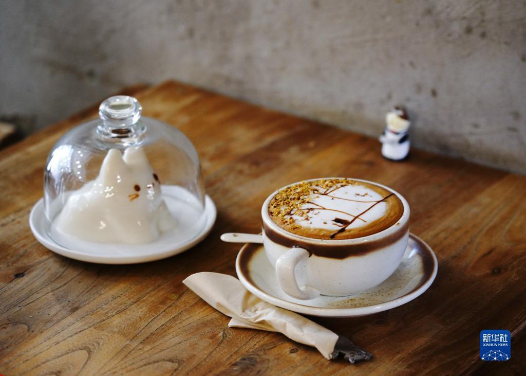 “鼓捣猫呢”店内有猫咪设计元素的咖啡和甜品(6月7日摄)。