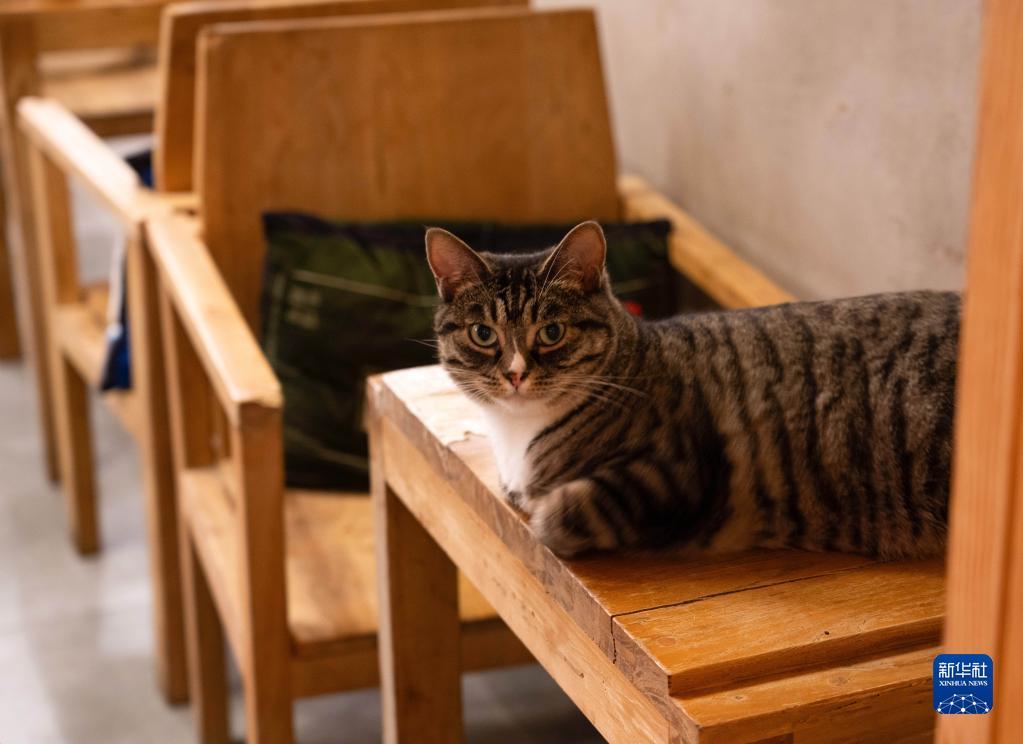 猫咪“小小美”与顾客对视(6月10日摄)。