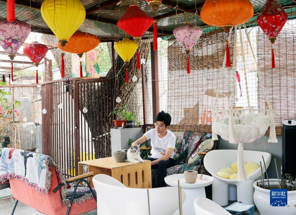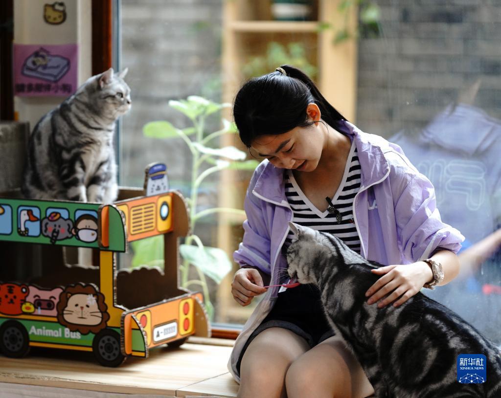 店主“于小猫”和猫咪在一起(6月7日摄)。