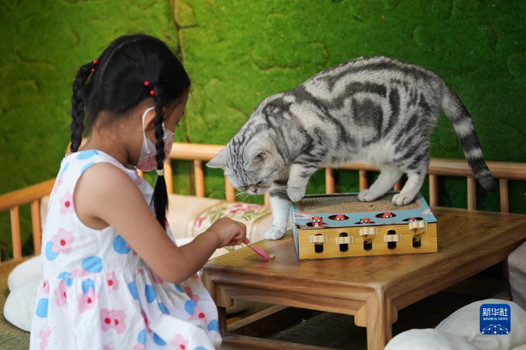 女孩与猫咪“尾牙”互动(6月10日摄)。