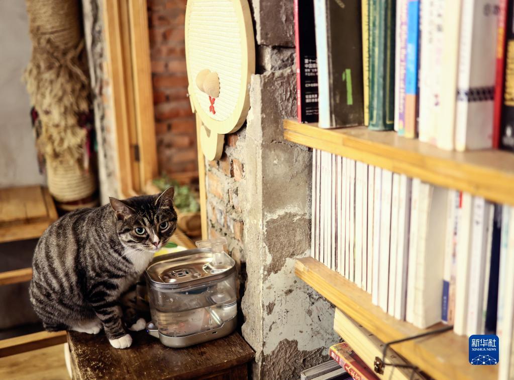 “爱看书”的猫咪“故知”在书架旁喝水(6月19日摄)。