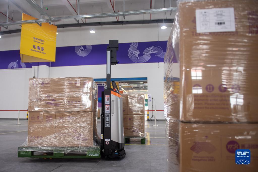 6月21日,自动叉车在第19届杭州亚运会物流中心内搬运包裹。