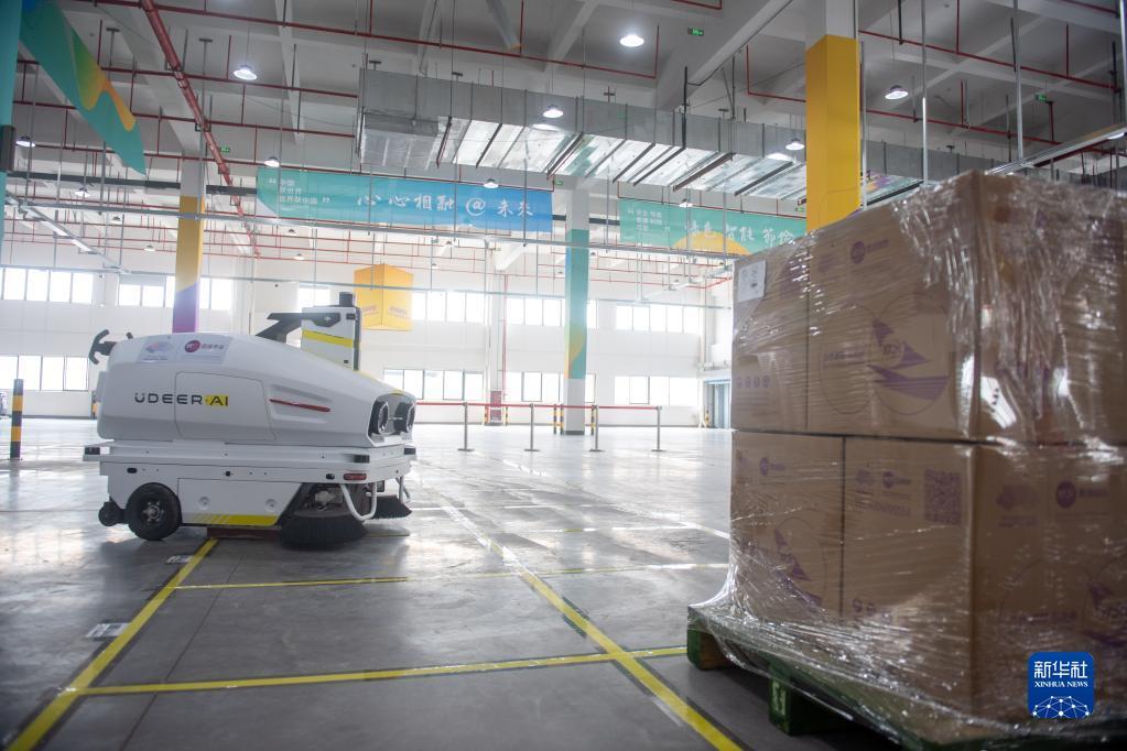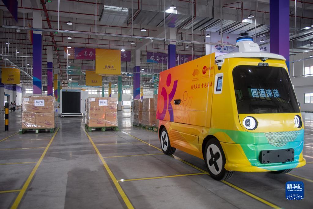 6月21日,无人车在第19届杭州亚运会物流中心内转运包裹。