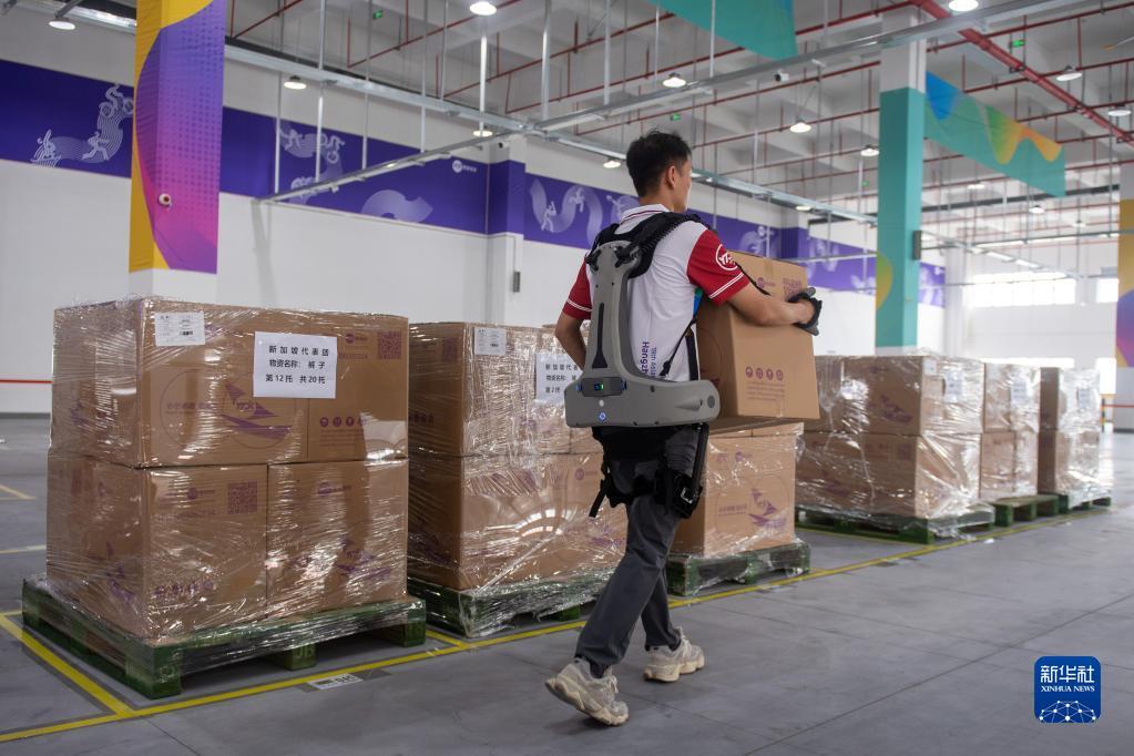 6月21日,杭州亚运会物流中心的工作人员使用外骨骼机器人辅助搬运包裹。