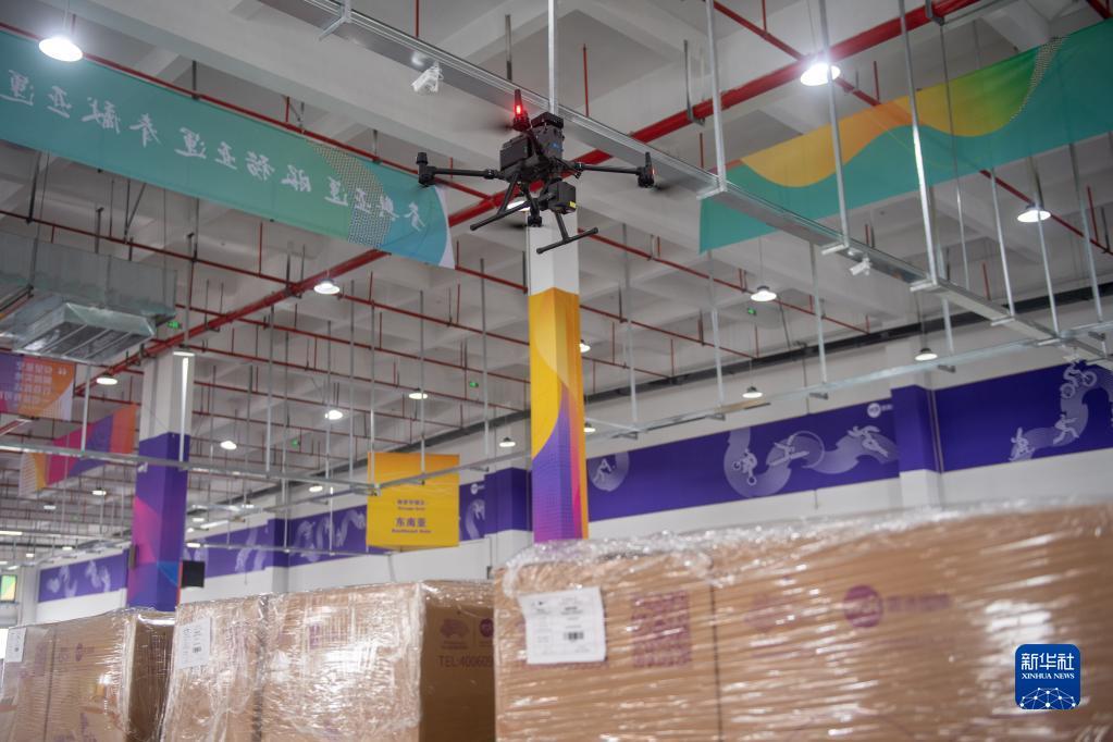6月21日,工作人员使用无人机对第19届杭州亚运会物流中心内的包裹进行清点。