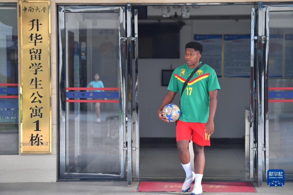 在中南大学体育场,何丁在足球比赛前进行热身(6月14日摄)。