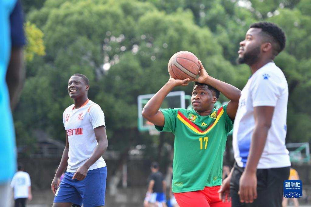 在中南大学体育场,何丁(右二)和同学一起打篮球(6月14日摄)。