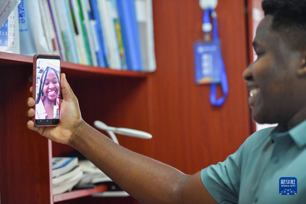 在中南大学升华留学生公寓,何丁和在喀麦隆的姐姐视频聊天(6月14日摄)。