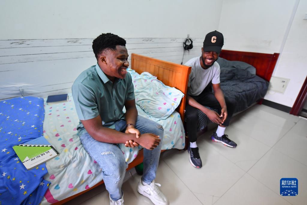 在中南大学升华留学生公寓,何丁(左)和室友聊天(6月14日摄)。