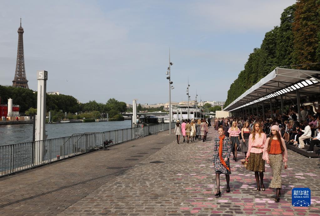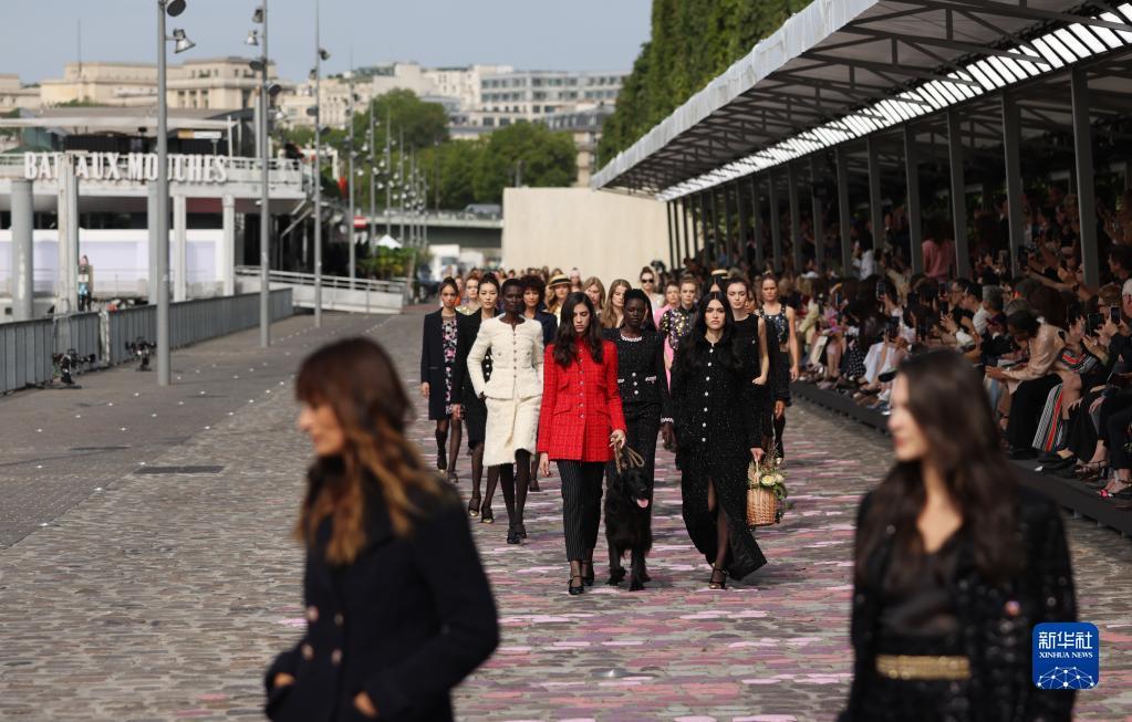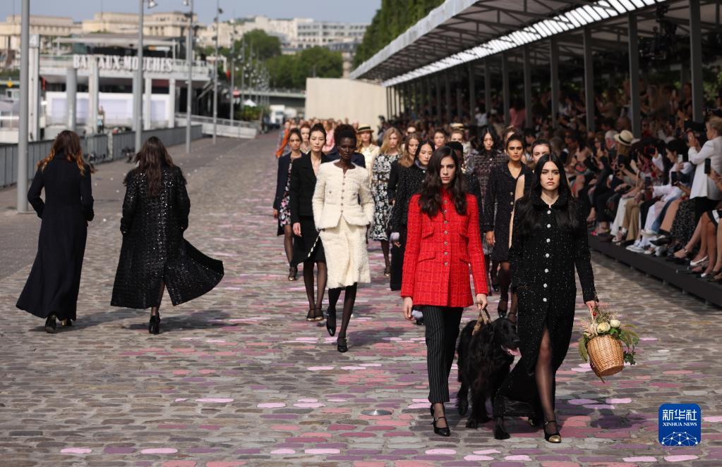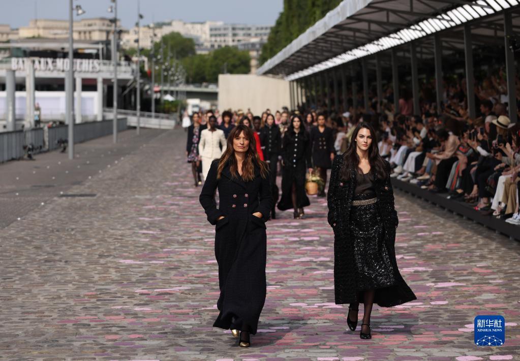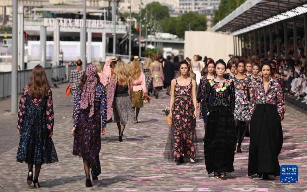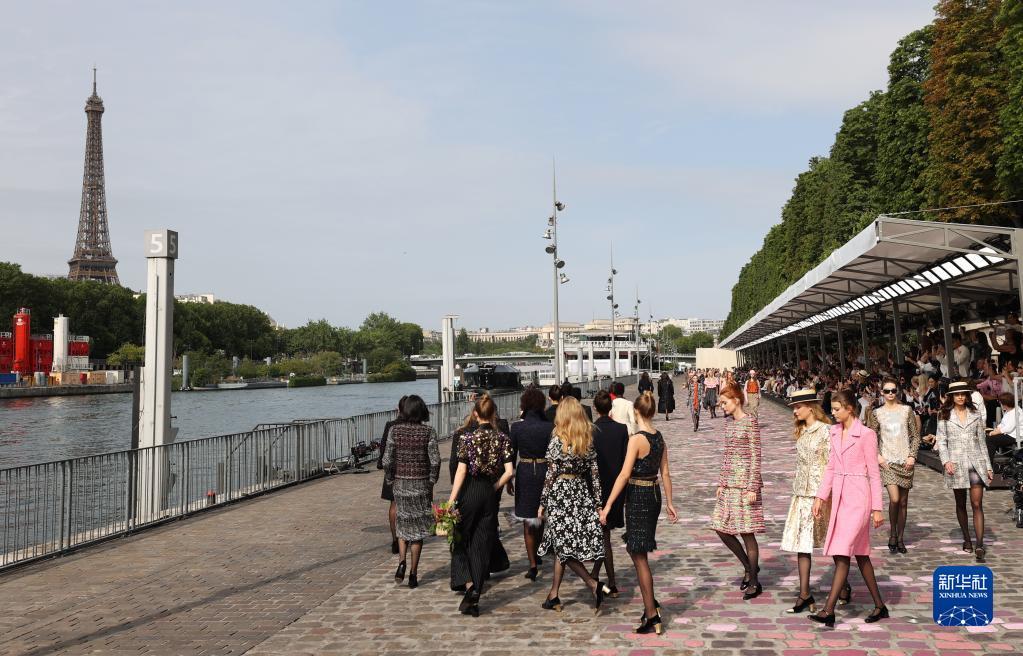 7月4日,在法国巴黎塞纳河边,模特展示法国品牌香奈儿2023/2024秋冬高级定制新品。