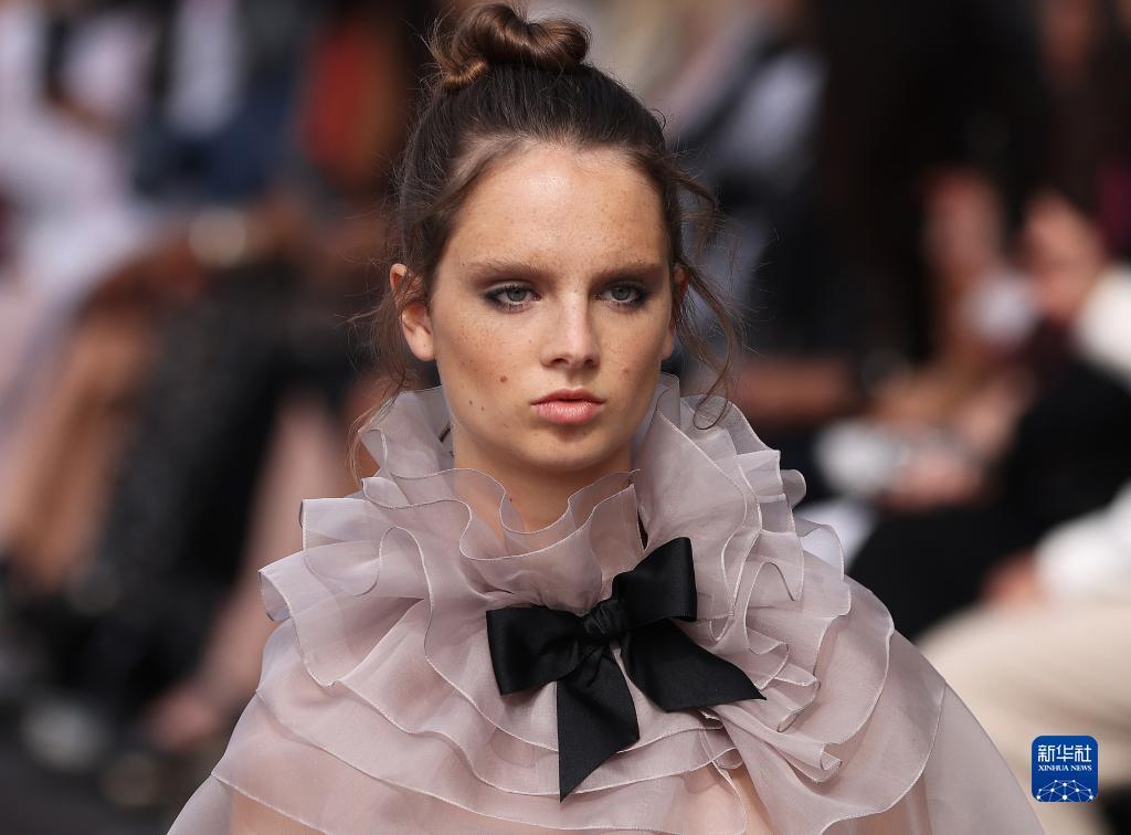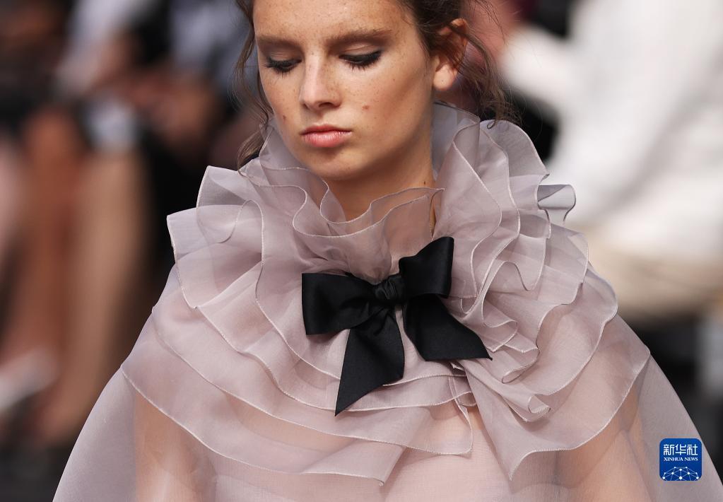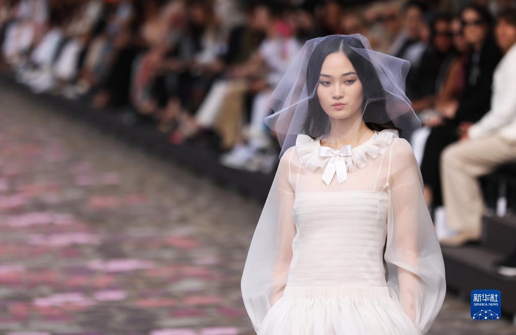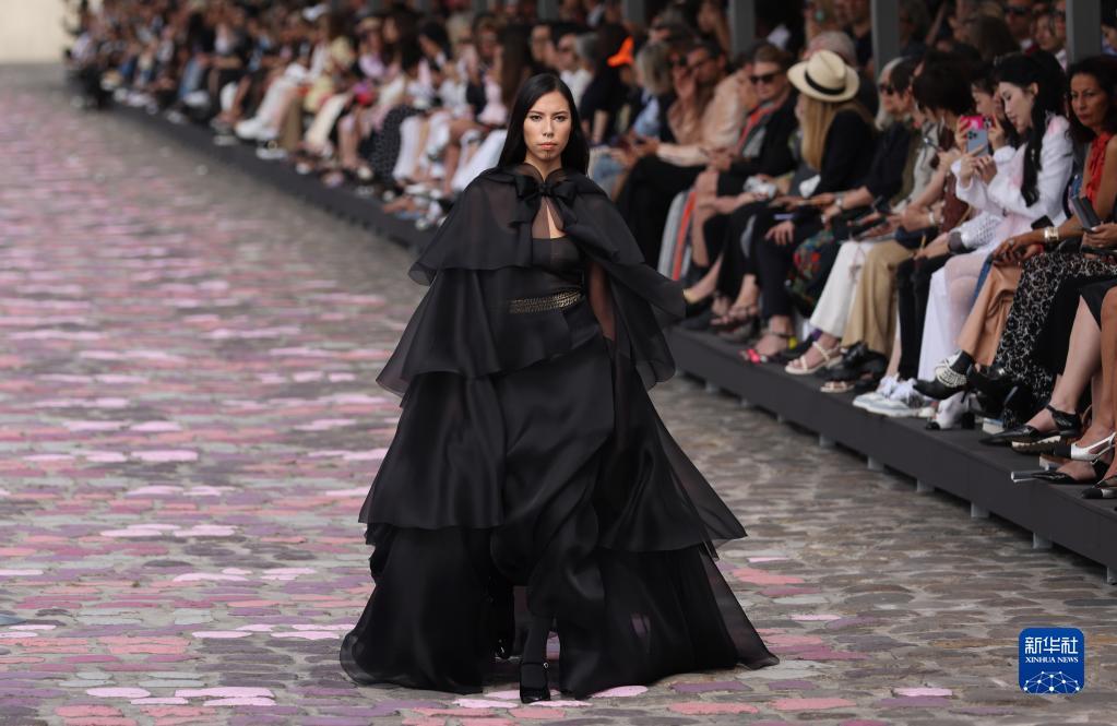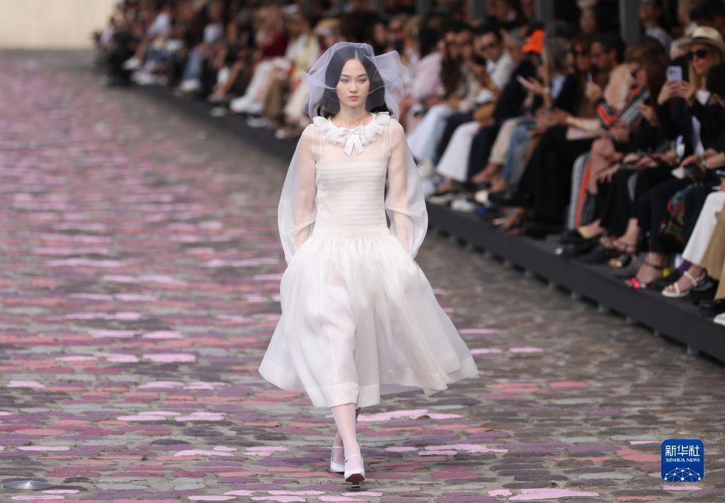 7月4日,在法国巴黎塞纳河边,模特展示法国品牌香奈儿2023/2024秋冬高级定制新品。