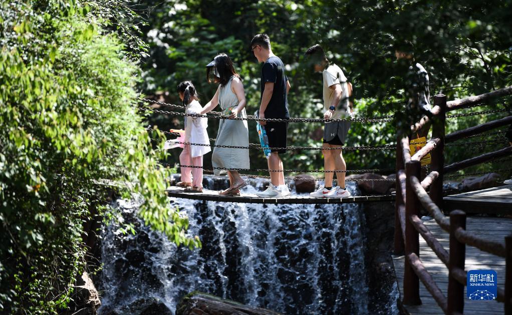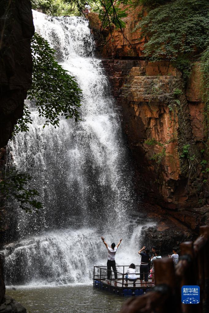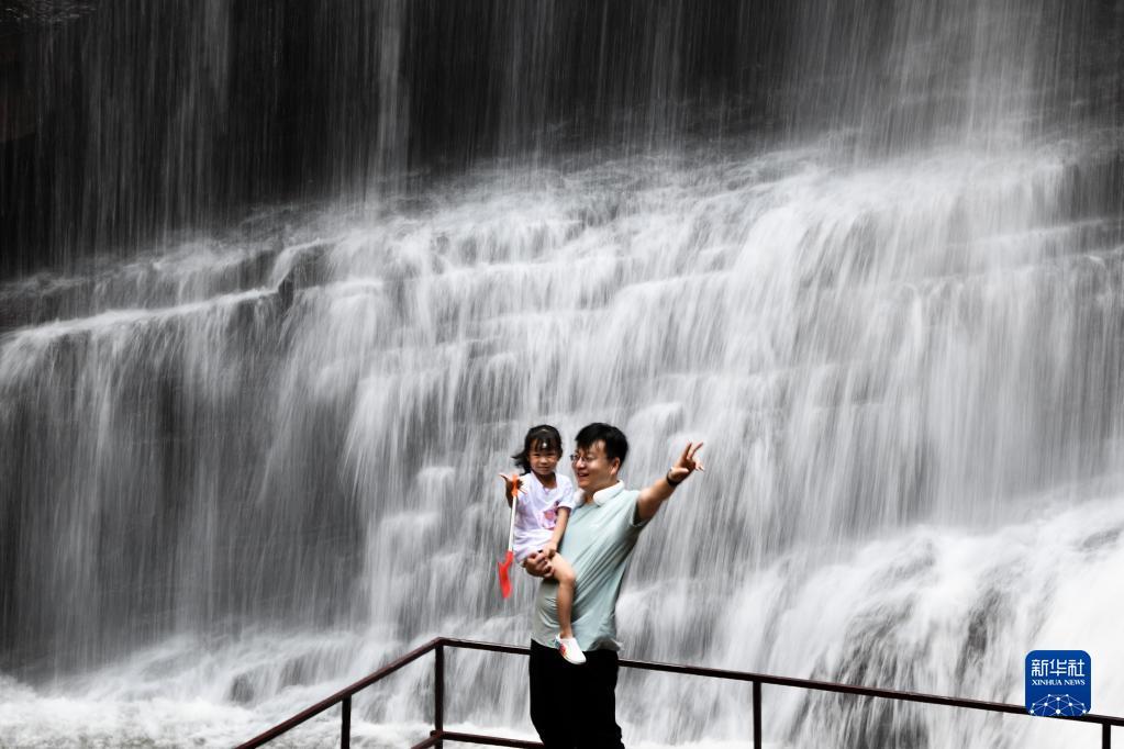 7月9日,游客在新密市伏羲山大峡谷内游玩。