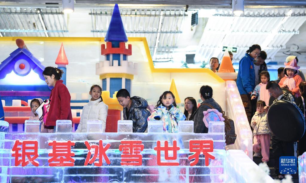 7月8日,游客在新密市银基国际旅游度假区冰雪世界内游玩。