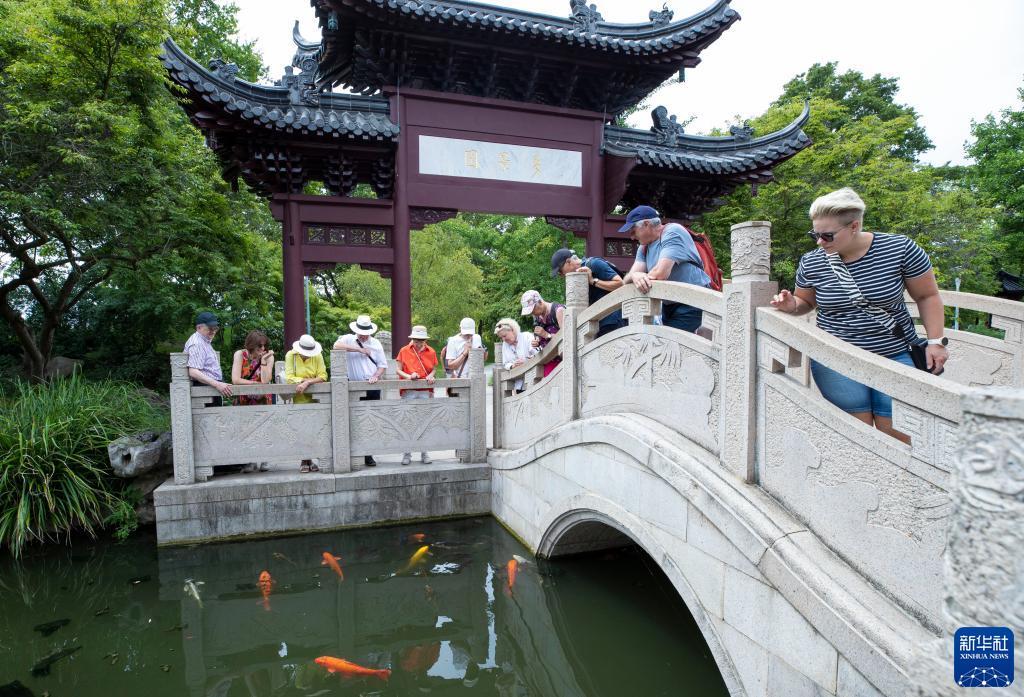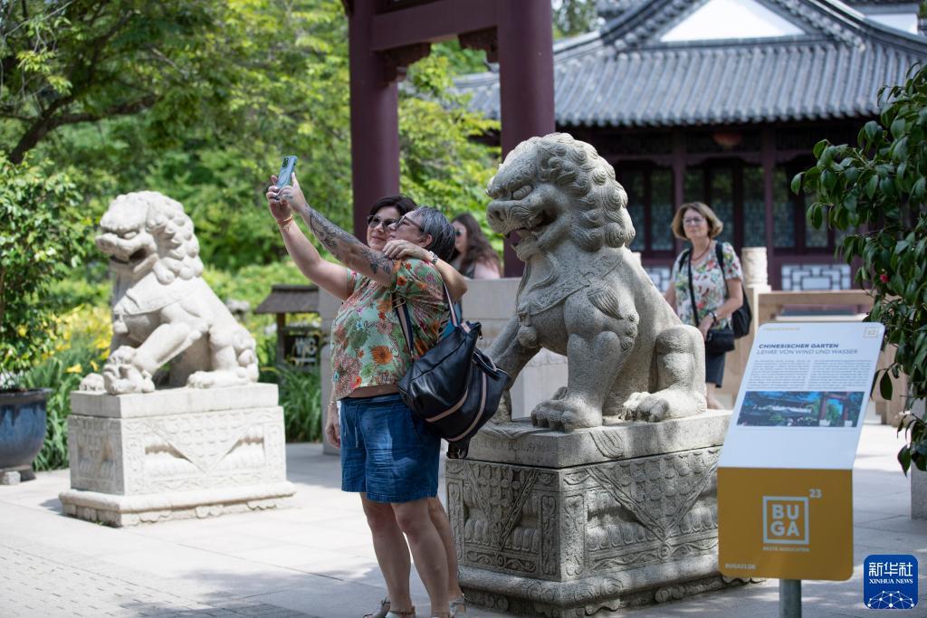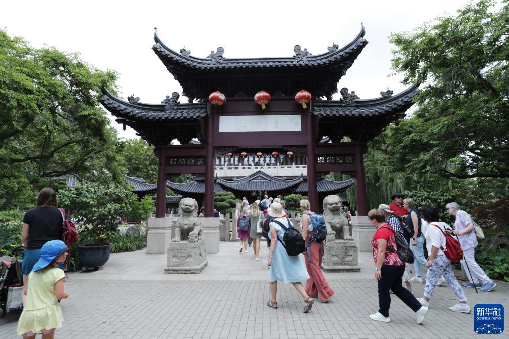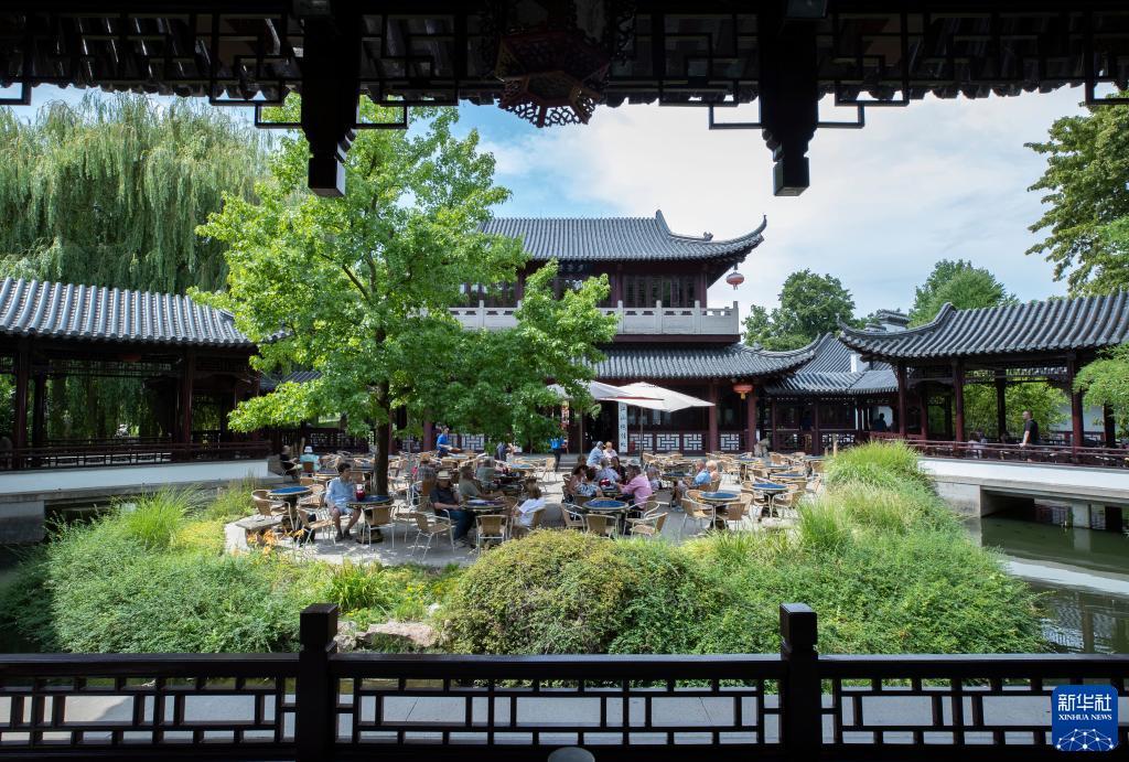 7月14日,游客在德国曼海姆的路易森公园内参观中国园林“多景园”。