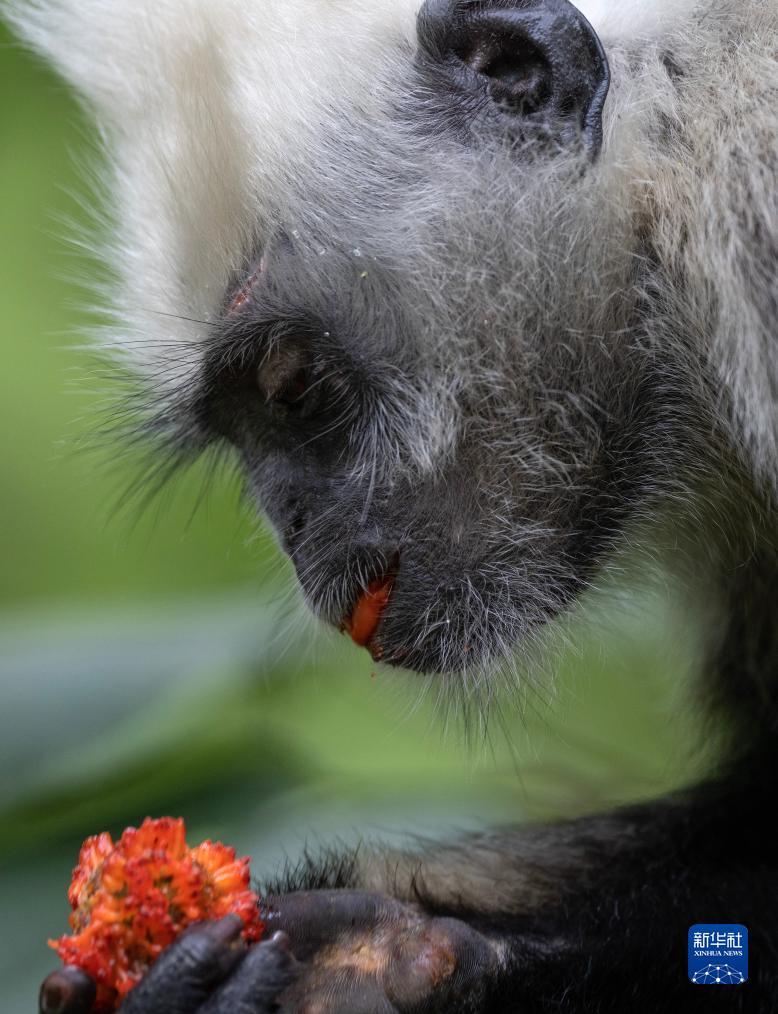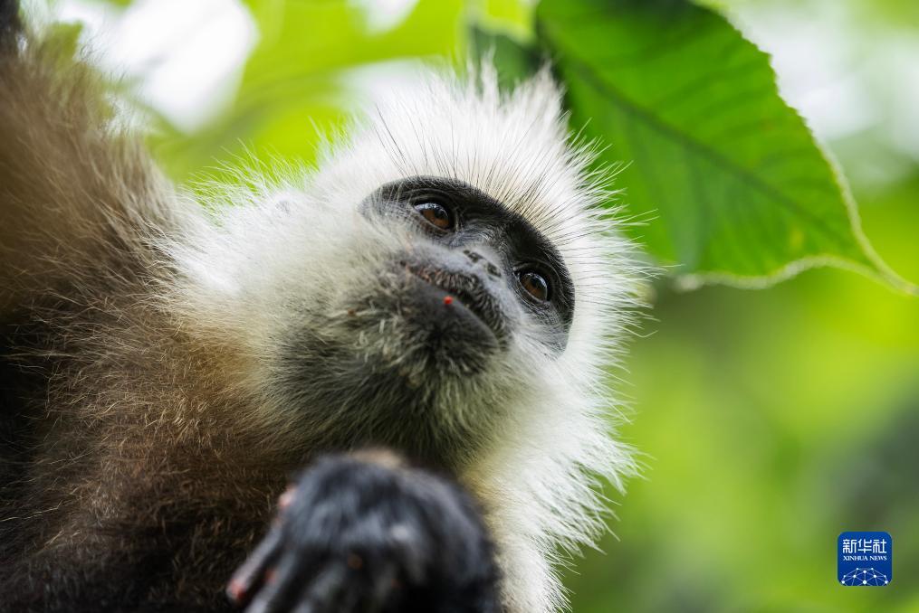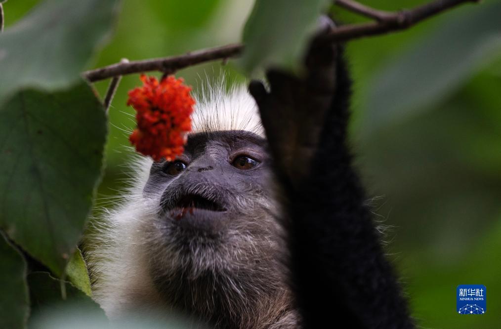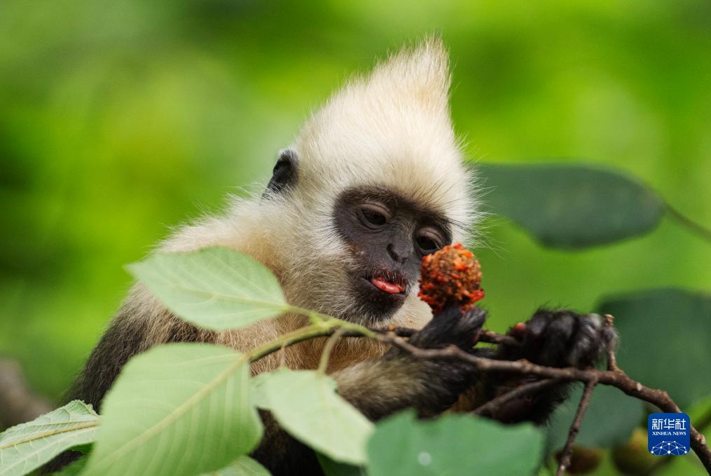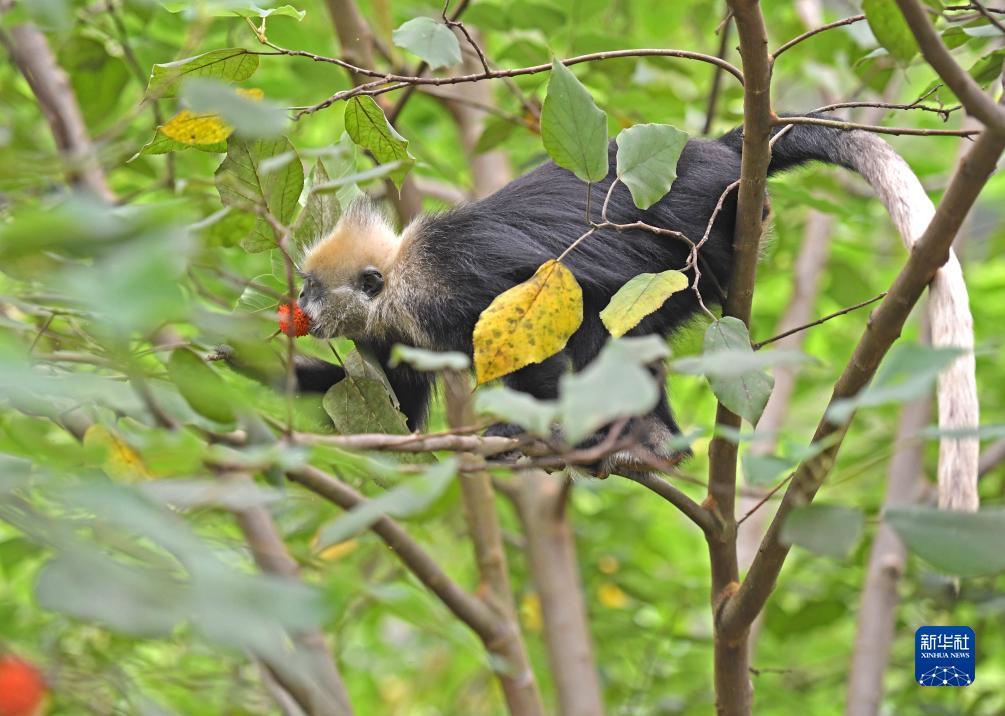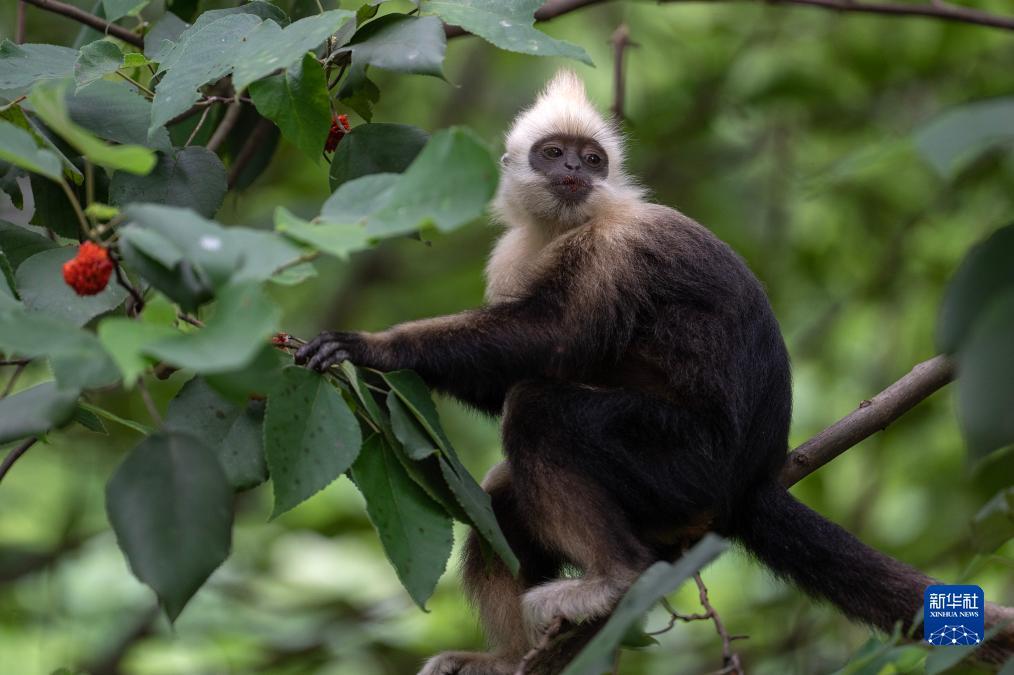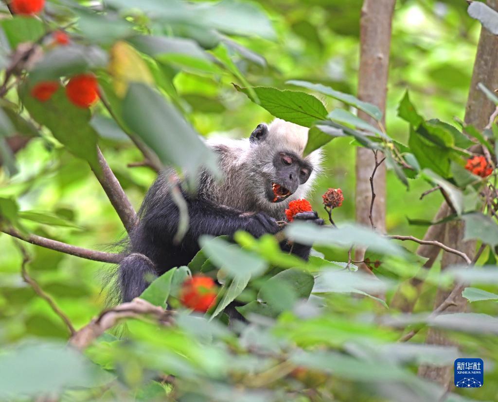 一只白头叶猴在吃构树的果实(8月4日摄)。