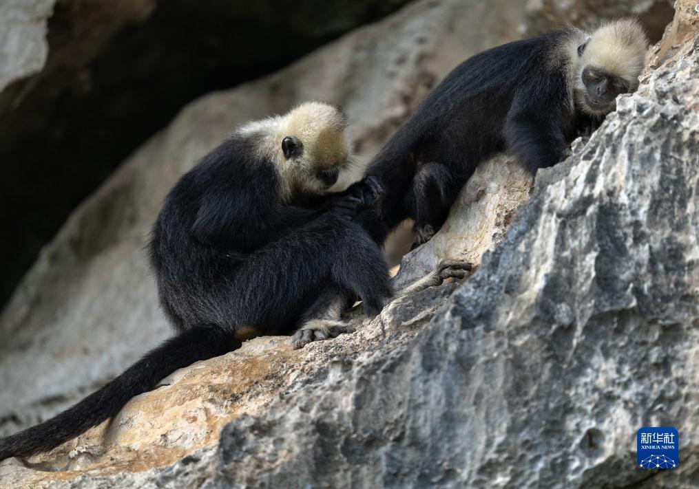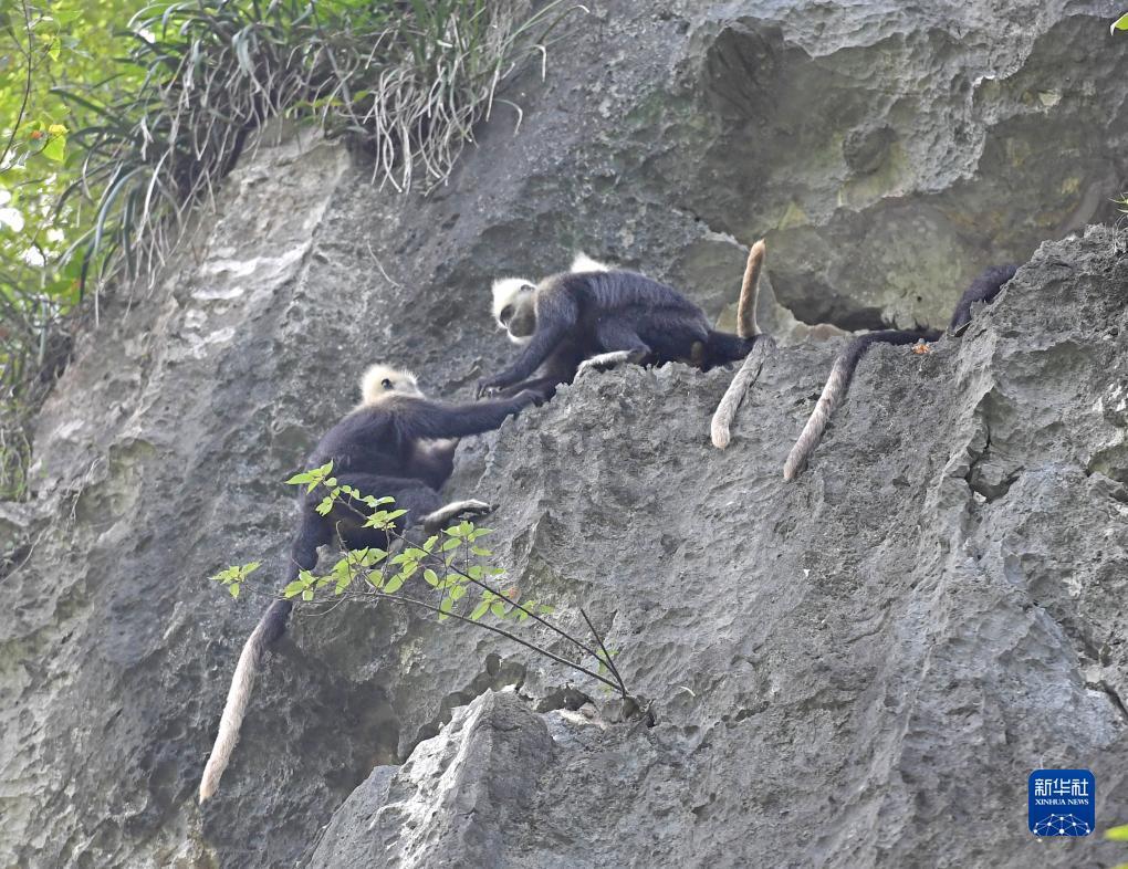 两只白头叶猴在岩壁上休憩(8月5日摄)。