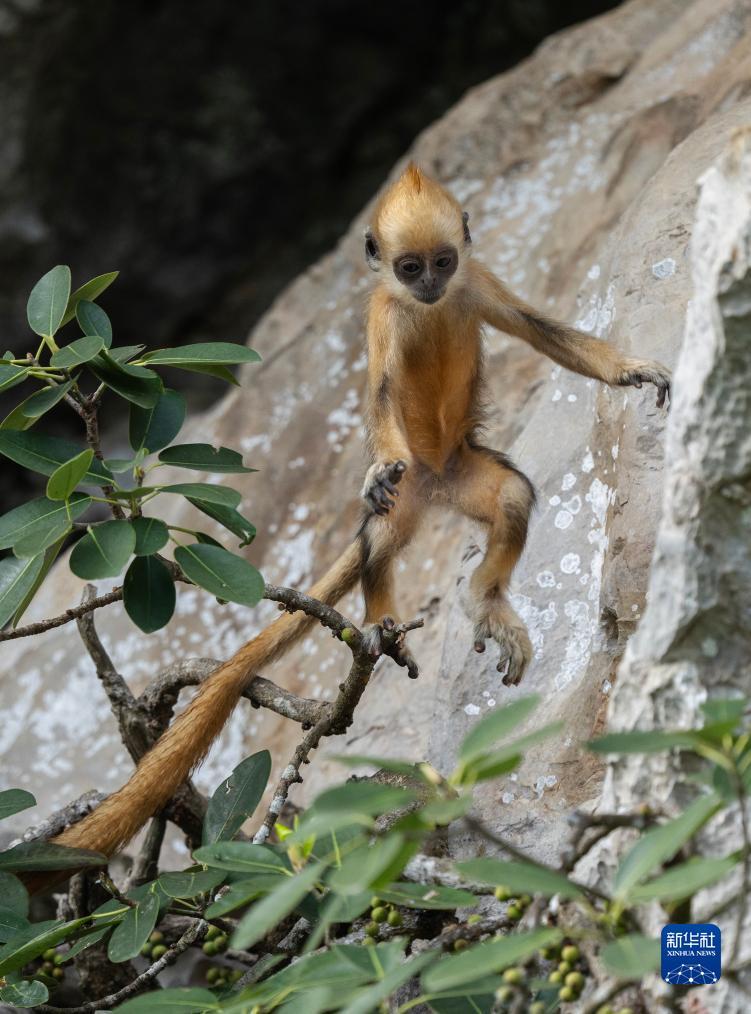 白头叶猴,头顶高耸着一撮白毛,是我国特有的国家一级重点保护野生动物,种群数量稀少,主要分布在广西崇左市左江和明江之间约200平方公里的喀斯特石山地区。白头叶猴还有个好听的名字——“石山精灵”。