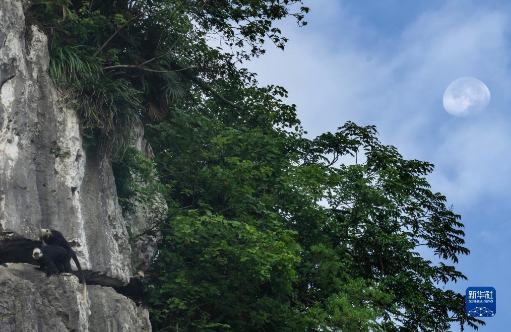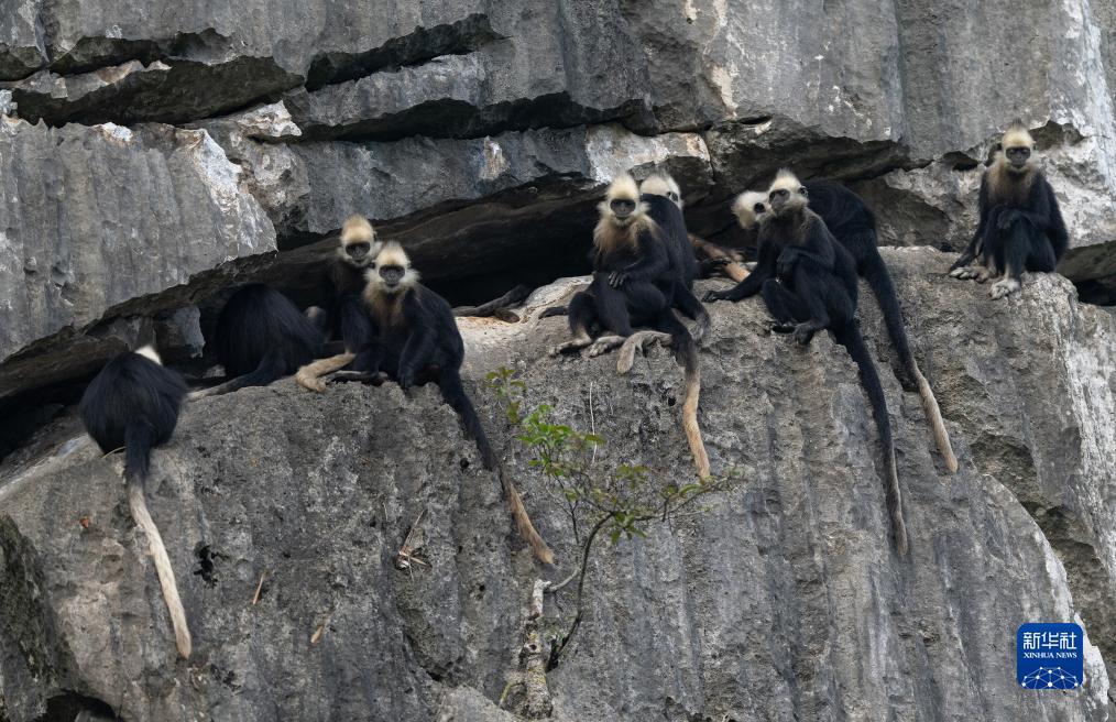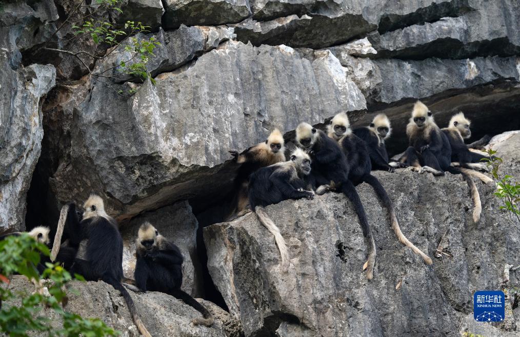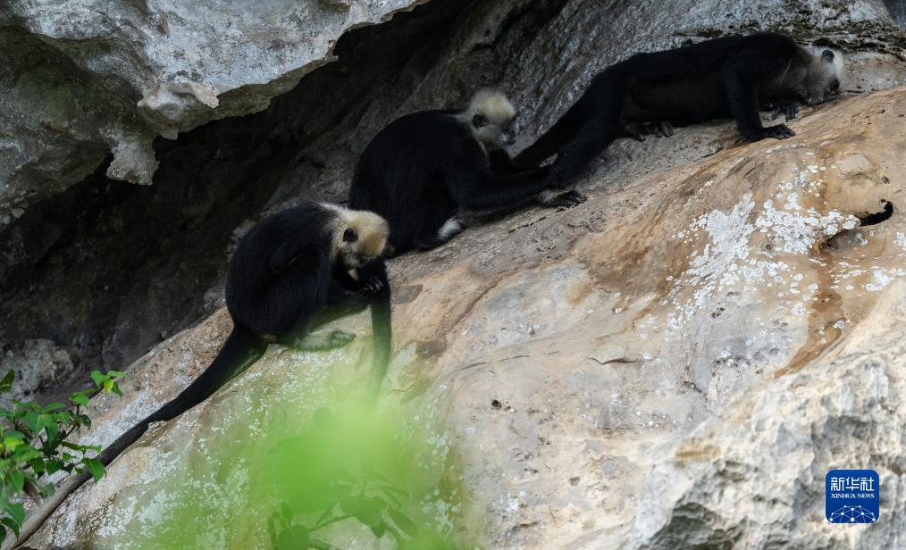 三只白头叶猴在岩壁上休憩(8月5日摄)。