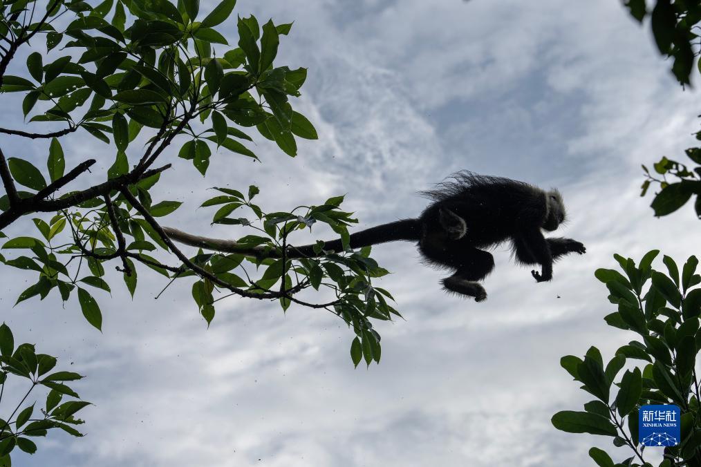 一只白头叶猴在林间跳跃(8月5日摄)。