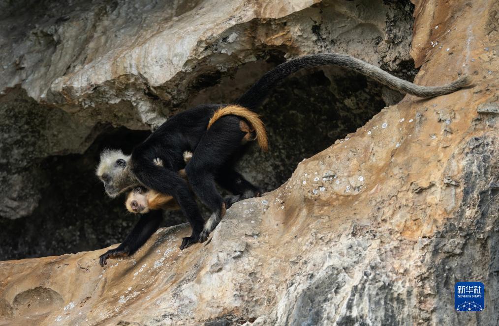 一只白头叶猴抱着幼猴在岩壁上行走(8月5日摄)。