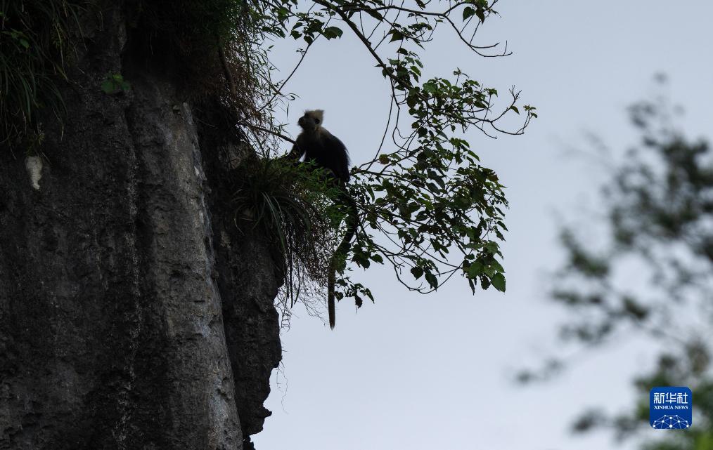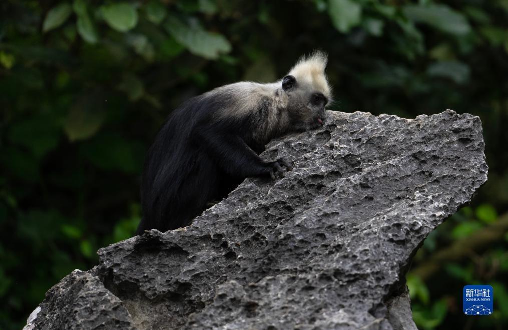 一只白头叶猴在岩壁上休憩(8月5日摄)。