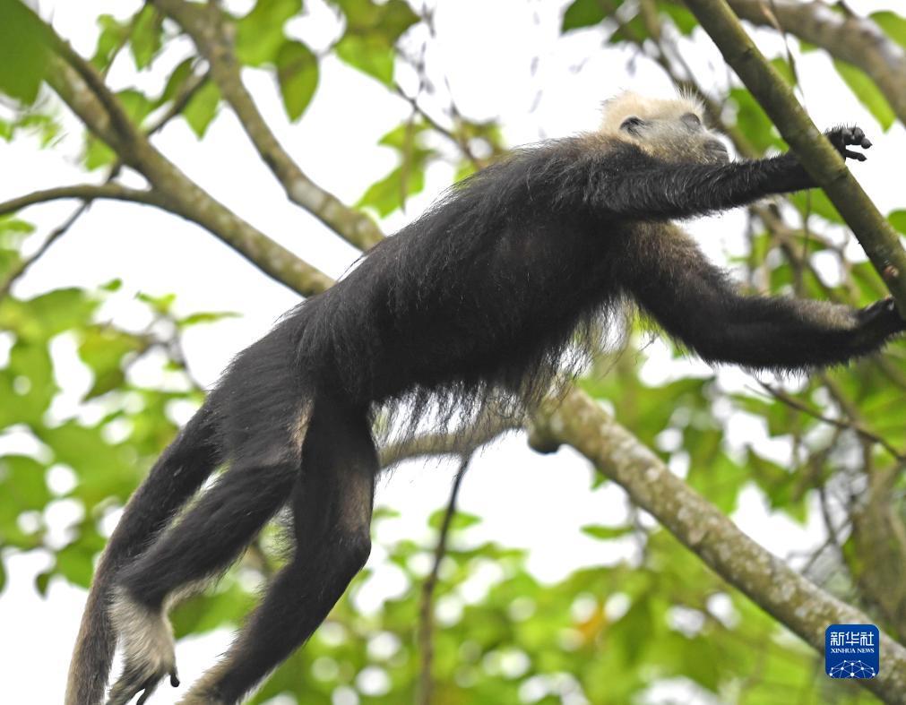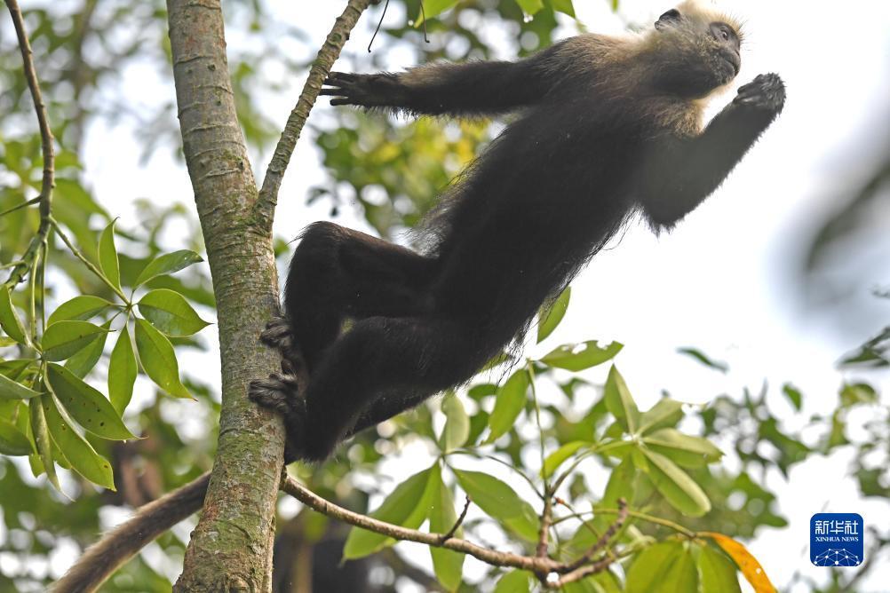 一只白头叶猴在树林中觅食(8月5日摄)。