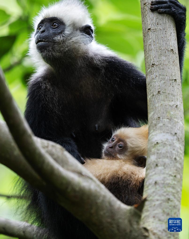 一只白头叶猴抱着幼猴觅食(8月4日摄)。