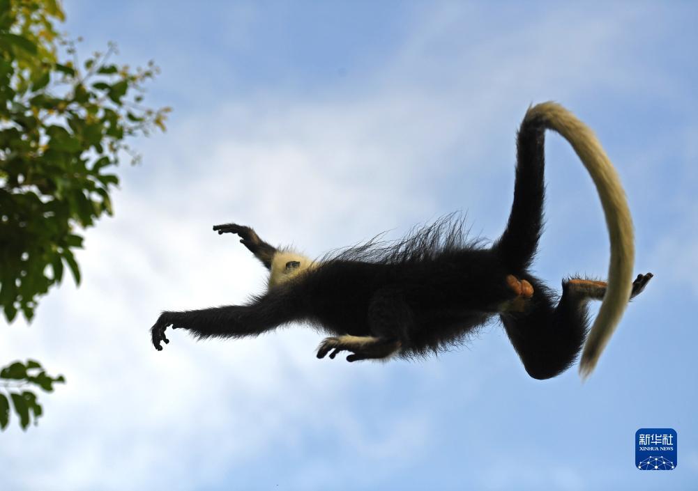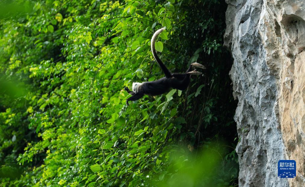 一只白头叶猴从悬崖上跃向树林(8月5日摄)。