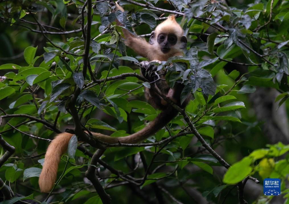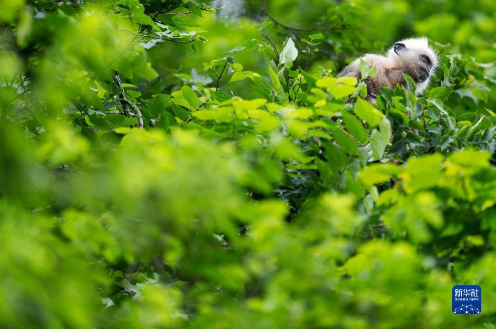 一只白头叶猴幼猴在树上张望(8月5日摄)。