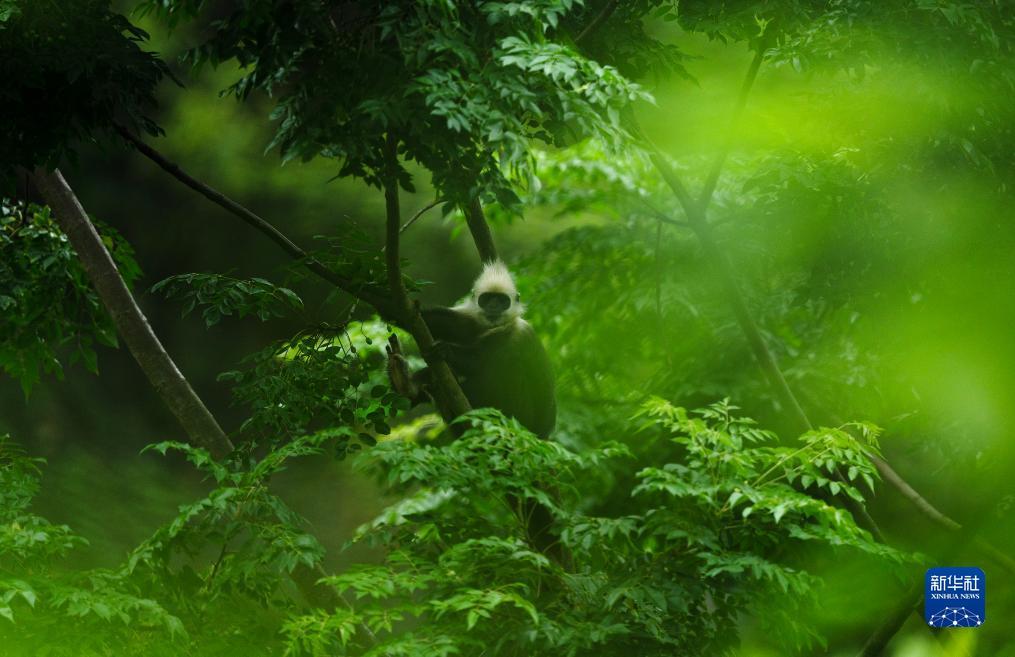 一只白头叶猴在林中休憩(8月4日摄)。