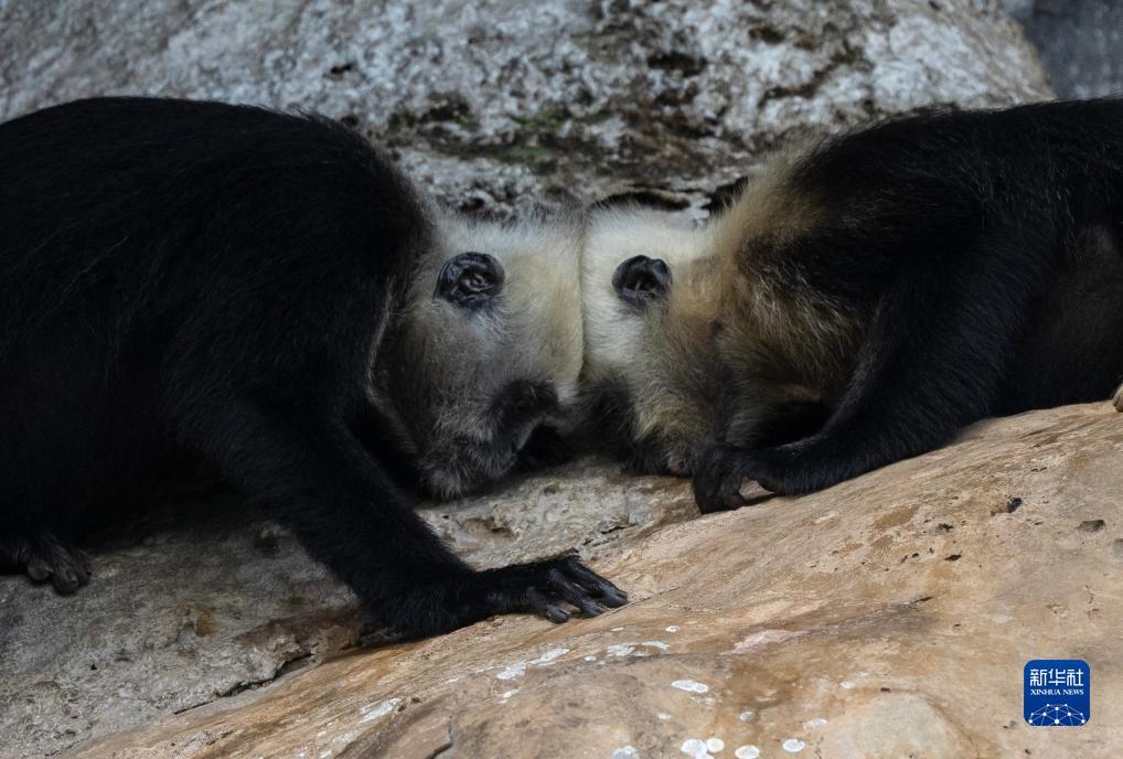 两只白头叶猴在玩顶头的游戏(8月5日摄)。