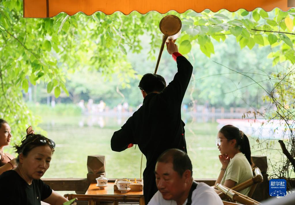 掺茶师傅为客人表演“一帆风顺”(8月7日摄)。