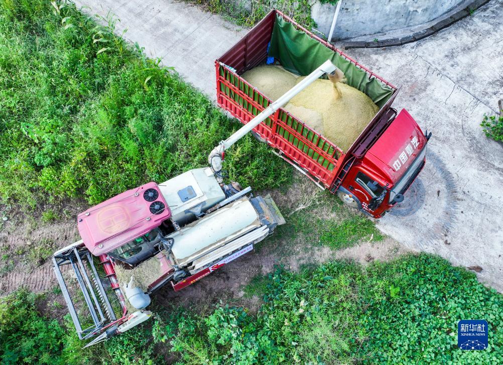 8月13日,在永川区吉安镇金门村,收割机将稻谷转运至装谷车内(无人机照片)。