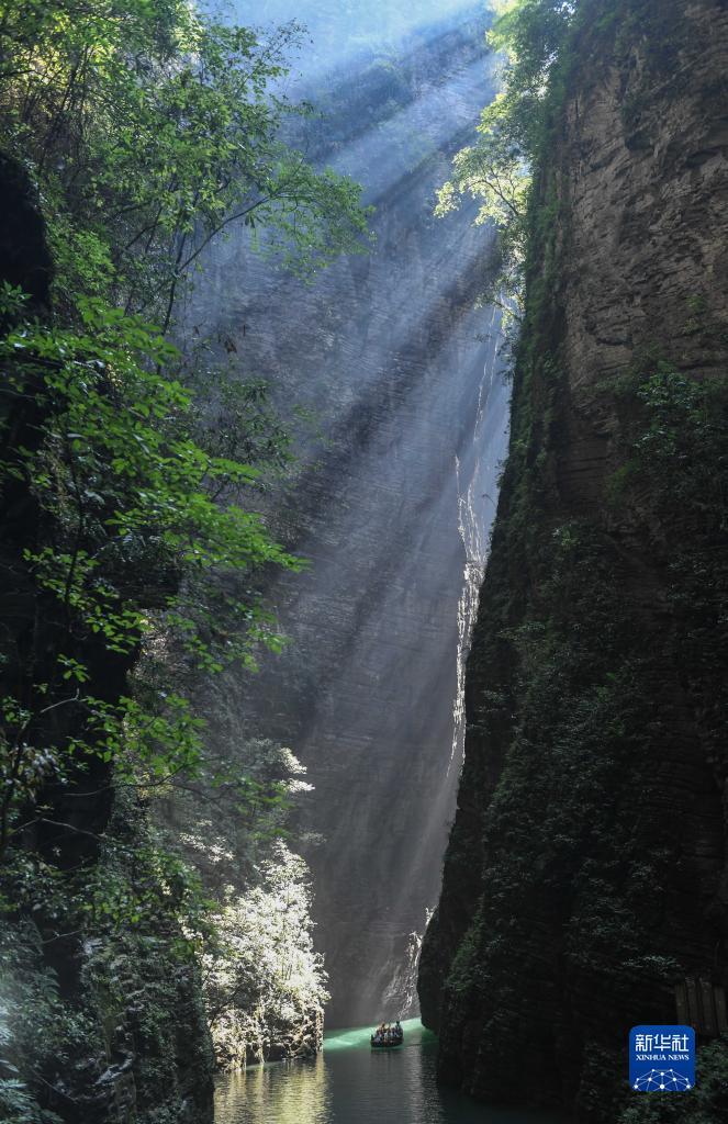 湖北省恩施土家族苗族自治州鹤峰县森林覆盖率高,空气清新,气候宜人。位于该县容美镇的屏山峡谷,全长约18公里,峰峦与河谷高差达千米,最窄处仅五尺,形成罕见的峡谷和地缝特色风光,碧水、轻舟与绝壁、森林相映成趣,每年吸引众多海内外游客前来观光。