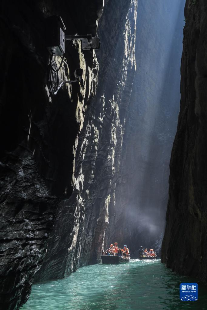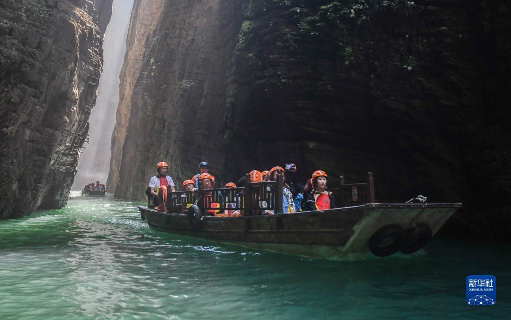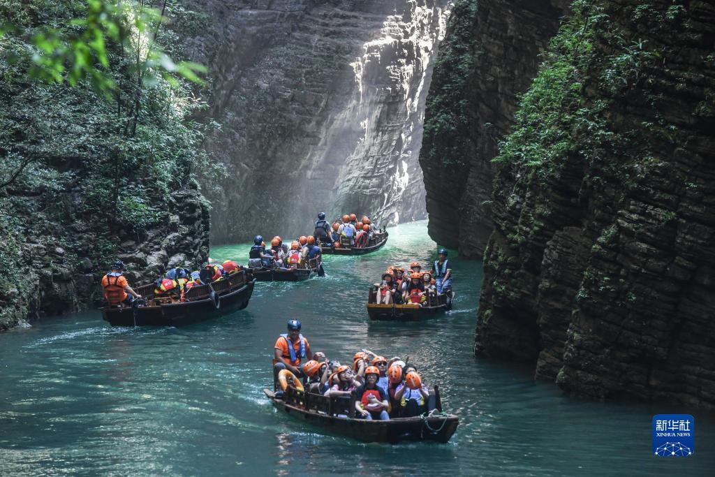 8月16日,游客在屏山峡谷谷底乘船游玩。