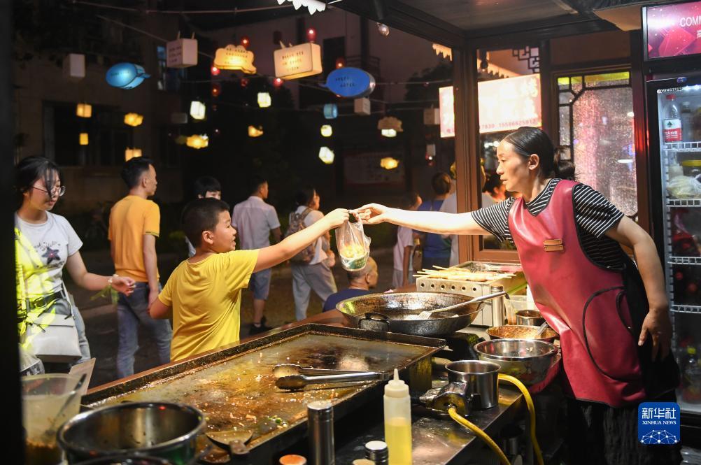 8月18日,小朋友在夜市上购买小吃。
