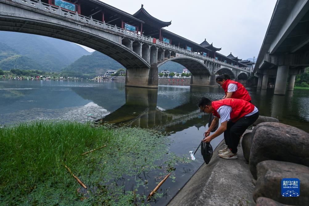 8月25日,青年党员志愿者在湖源乡壶源溪龙麟坝段清理垃圾。