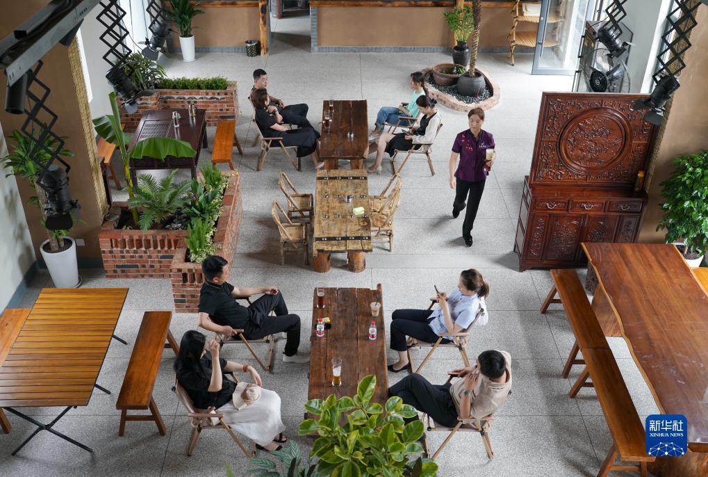 游客在秦岭北麓脚下的西安市周至县马召镇辛口村一家驿站内休闲(7月14日摄)。
