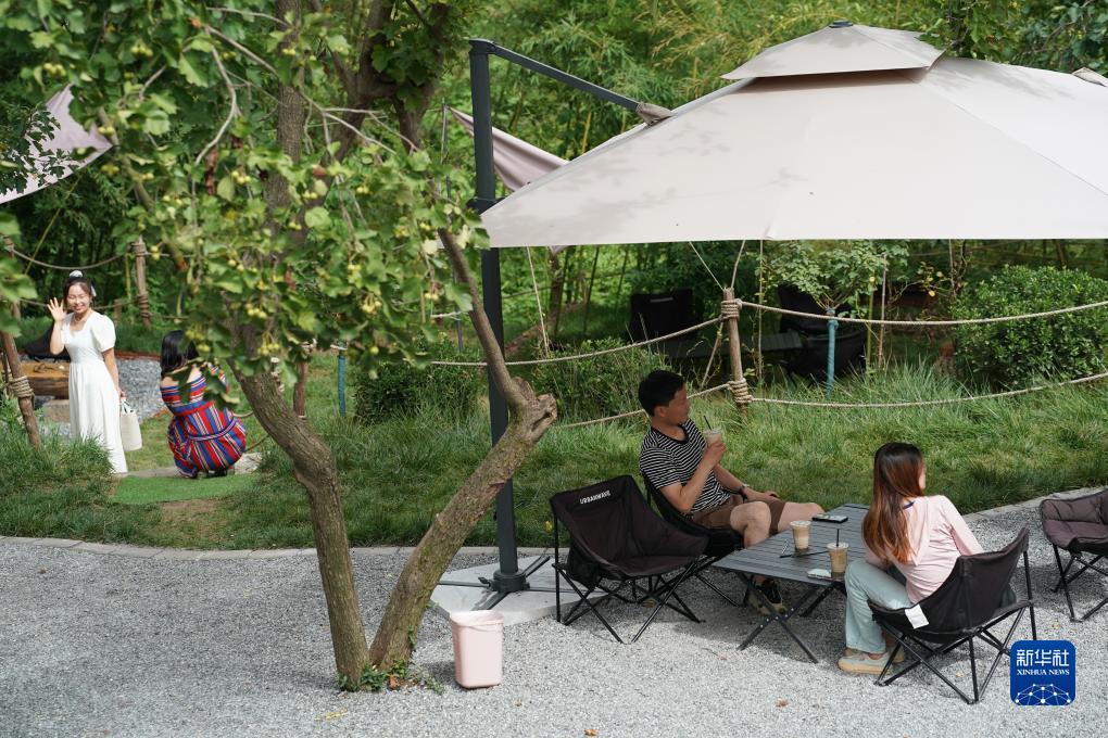 游客在秦岭北麓的西安市周至县马召镇辛口村一家咖啡馆的营地内休闲(7月14日摄)。