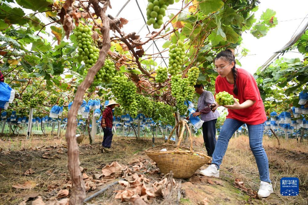 8月30日,潘雅洁(右一)在肥西县紫蓬镇的葡萄园里采摘葡萄。